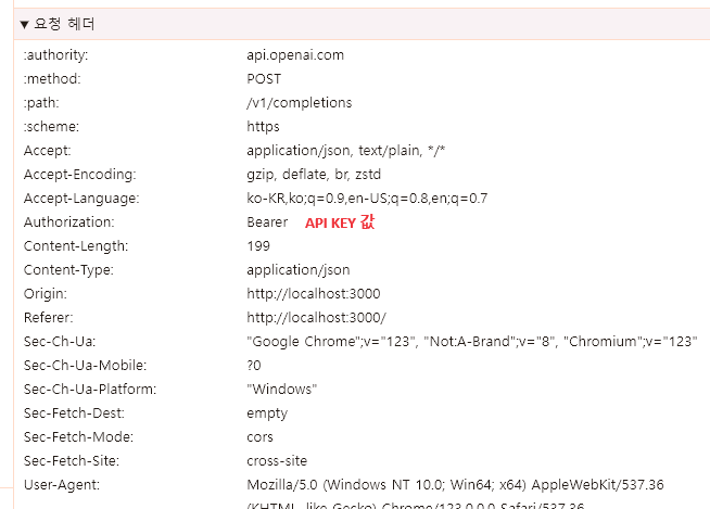 네트워크 탭의 요청 url과 요청 헤더에 api key값이 노출이 되버린다.
