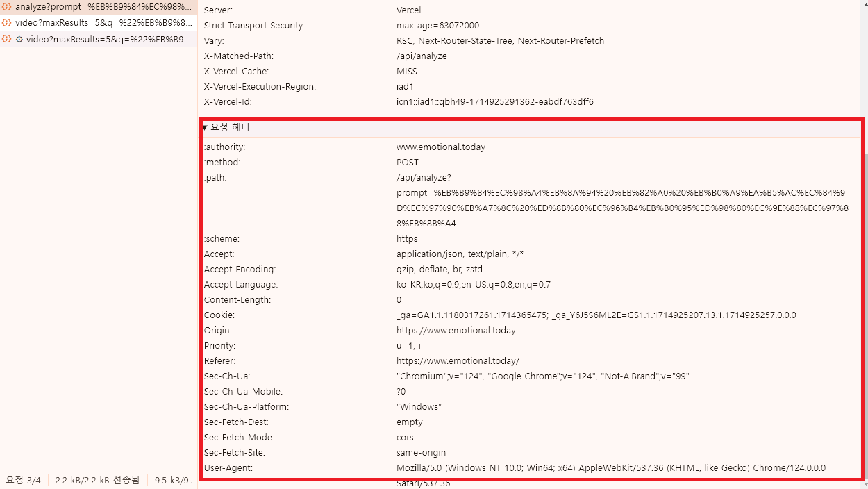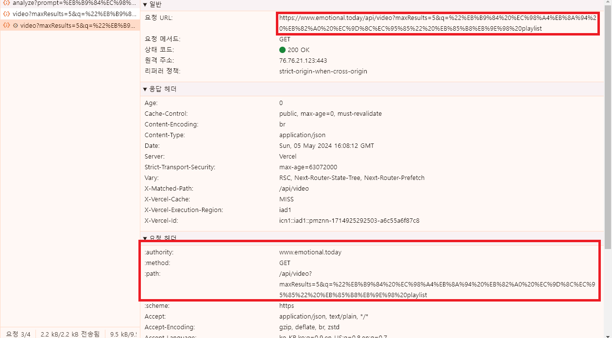 api라우트를 사용하면 아까전과 다르게 엔드포인트도 /api/analze와 /api/video로 변경되었고