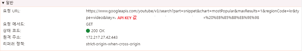 이렇게 하니 엔드포인트가 /api/test로 끝나고 이런 방식을 사용하면 원래 노출되었던 youtube key값이 파라미터에 노출되지 않는다.
